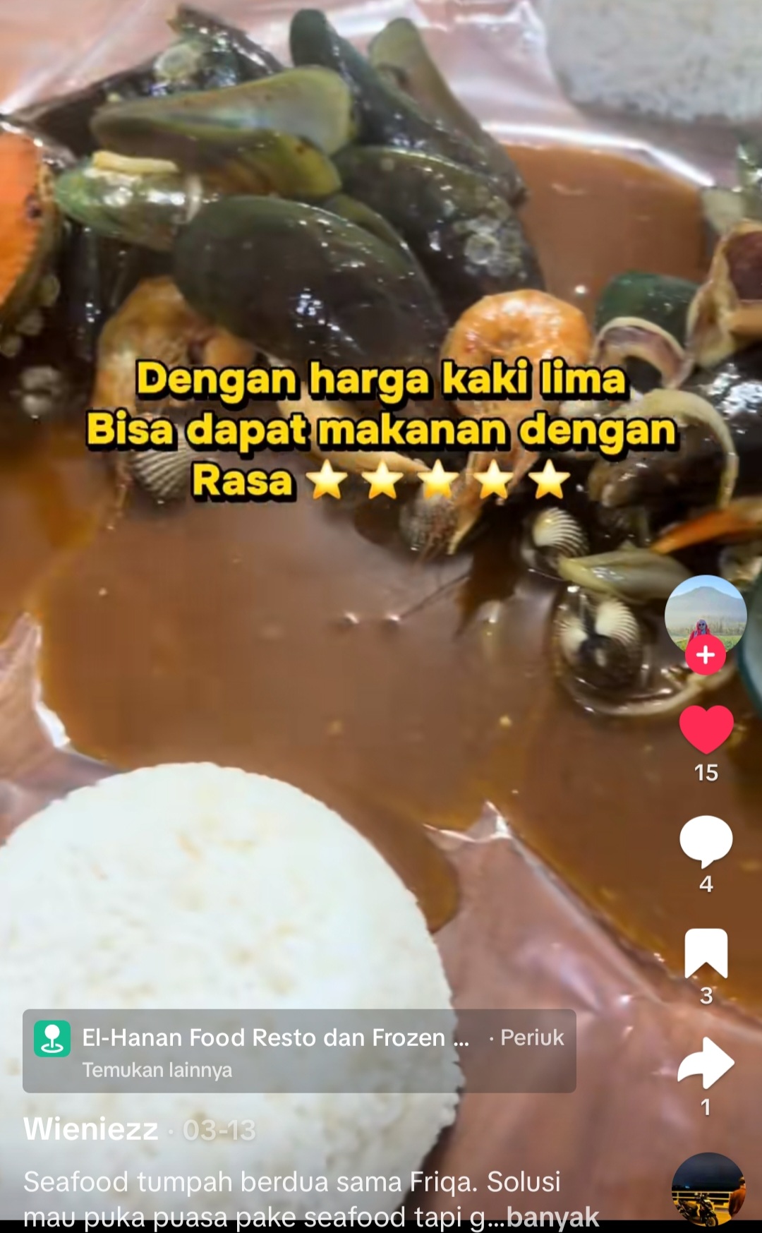 “Solusi mau makan seafood tapi gak mau ribet masak”, tulisnya dalam postingan video seafood tumpah yang ditampakkan.