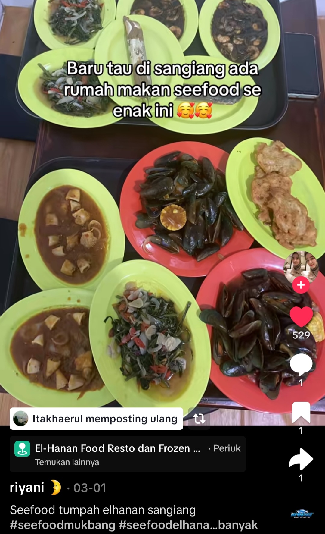 Pujian serupa diungkap akun riyani, saat makan bersama keluarga besarnya di lokasi. Akun ini memposting banyak sajian menu yang dipesannya, dengan tulisan “Baru tau di Sangiang ada rumah makan seafood seenak ini”.