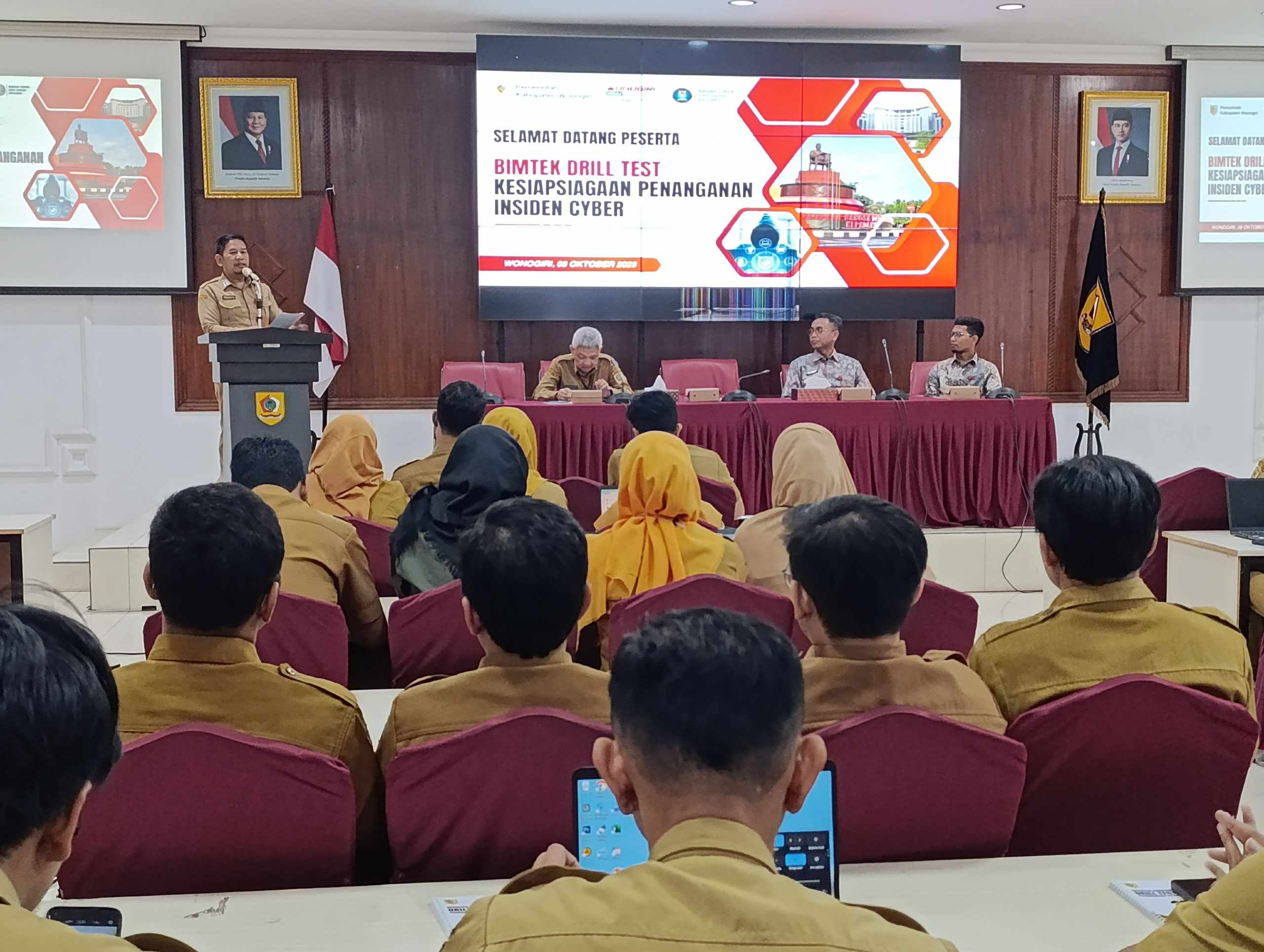 Oleh karena itu, Dinas Komunikasi dan Informatika (Kominfo) Kabupaten Wonogiri menggelar bimbingan teknis (bimtek) kegiatan peningkatan kapasitas sumber daya manusia, khususnya ASN di lingkungan Pemerintah Kabupaten Wonogiri, dalam hal penanganan insiden siber. Kegiatan yang diselenggarakan di Ruang Girimanik Komplek Sekretariat Daerah kabupaten Wonogiri ini dilaksanakan dua hari, yakni pada hari Selasa-Rabu (7-8/10/2025). Dua narasumber dari Badan Siber dan Sandi Negara (BSSN) Republik Indonesia dihadirkan untuk memandu para peserta melakukan praktik Drill Test Kesiapsiagaan Penanganan Insiden Siber.
