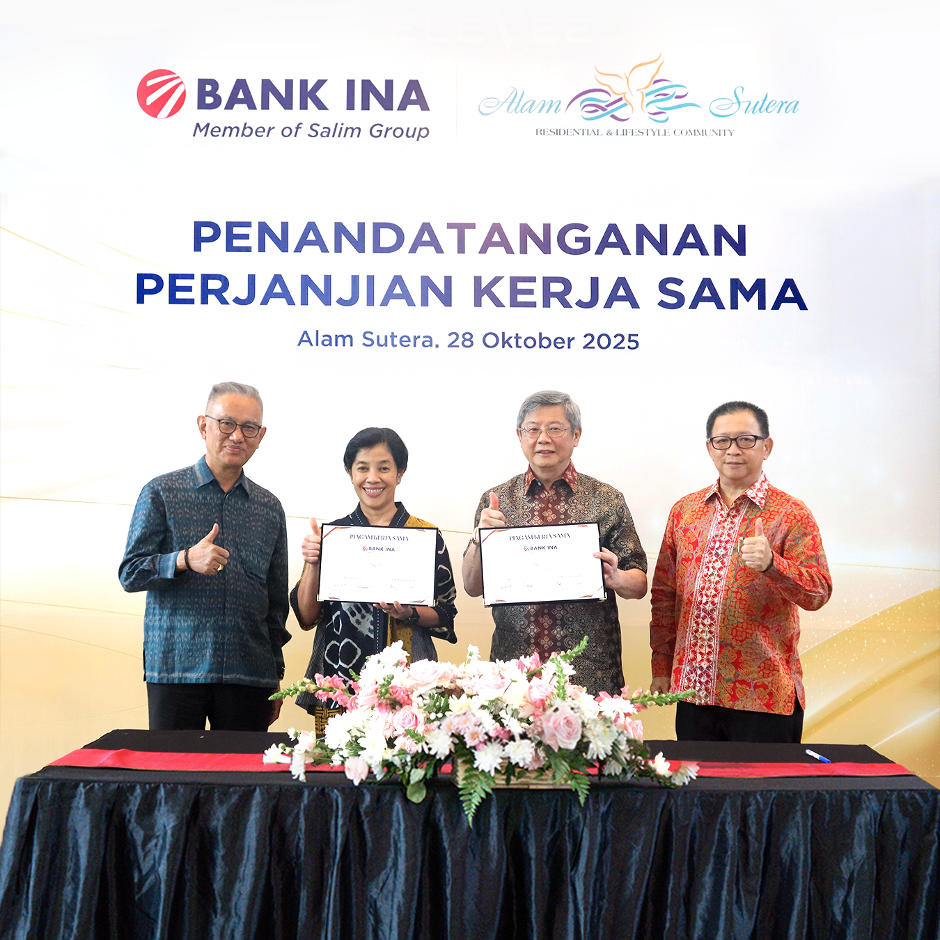 “Kemudahan memiliki properti adalah hal yang selalu diupayakan Alam Sutera Group terkhusus bagi para pembeli yang menbutuhkan KPP. Sejalan dengan hal tersebut, kami melihat Bank INA memiliki komitmen dan fleksibilitas dalam mendukung kebutuhan pembiayaan pemilikan rumah. Kami percaya kolaborasi ini dapat memberikan pengalaman lebih baik bagi konsumen yang ingin memiliki properti di proyek-proyek Alam Sutera,” ujar Lilia Sukotjo, Direktur Alam Sutera Group.
