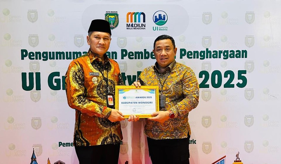 Wonogiri (MKNews)-Hattrick! Pemerintah Kabupaten Wonogiri berhasil meraih prestasi dalam ajang UI Greencity Metric Ranking Tahun 2025. Penghargaan bergengsi ini diterima Kabupaten Wonogiri bersama dengan 16 kabupaten/kota dari seluruh indonesia.  Bupati Wonogiri, Setyo Sukarno hadir secara langsung untuk menerima penghargaan tersebut Kamis (2/10/2025) di Madiun didampingi Kepala Badan Perencanaan Pembangunan Riset dan Inovasi Daerah (Bapperida) Wonogiri, Heru Utomo.