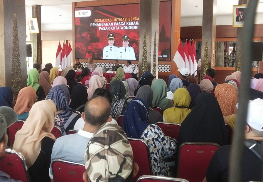 Wonogiri (MKNews)-Pemerintah Kabupaten Wonogiri siap membangun pasar darurat pasca kejadian kebakaran Pasar Kota Wonogiri, Senin (6/10/2025) lalu. Hal ini diumumkan langsung oleh Bupati Wonogiri Setyo Sukarno saat menggelar Sosialisasi Mitigasi Bencana Penanganan Paska Kebakaran Pasar Kota Wonogiri, Rabu (8/10/2025). Acara yang digelar di Pendopo Rumah Dinas Bupati Wonogiri ini dihadiri lebih dari 1.000 pedagang aktif Pasar Kota Wonogiri yang terdampak bencana kebakaran.
