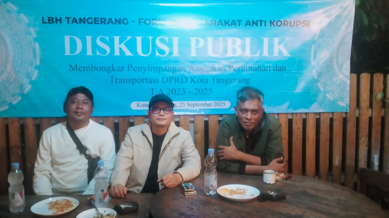 Tangerang  (MKNews)- Sejumlah aktivis, praktisi hukum, dan pegiat komunitas Kota Tangerang berkumpul dalam sebuah diskusi publik bertajuk “Membongkar Penyimpangan Tunjangan Perumahan dan Transportasi DPRD”. Acara yang digelar Kamis malam, 25 September 2025 disebuah coffe shop dibilangan Ciledug menghadirkan Rasyid Hidayat (Direktur LBH Tangerang) dan Hamdan (Forum Masyarakat Anti Korupsi) sebagai narasumber, dengan Samsuri Oblag, Wartawan dan juga Ketua Komunitas Info Warga Ciledug (IWC), bertindak sebagai moderator.