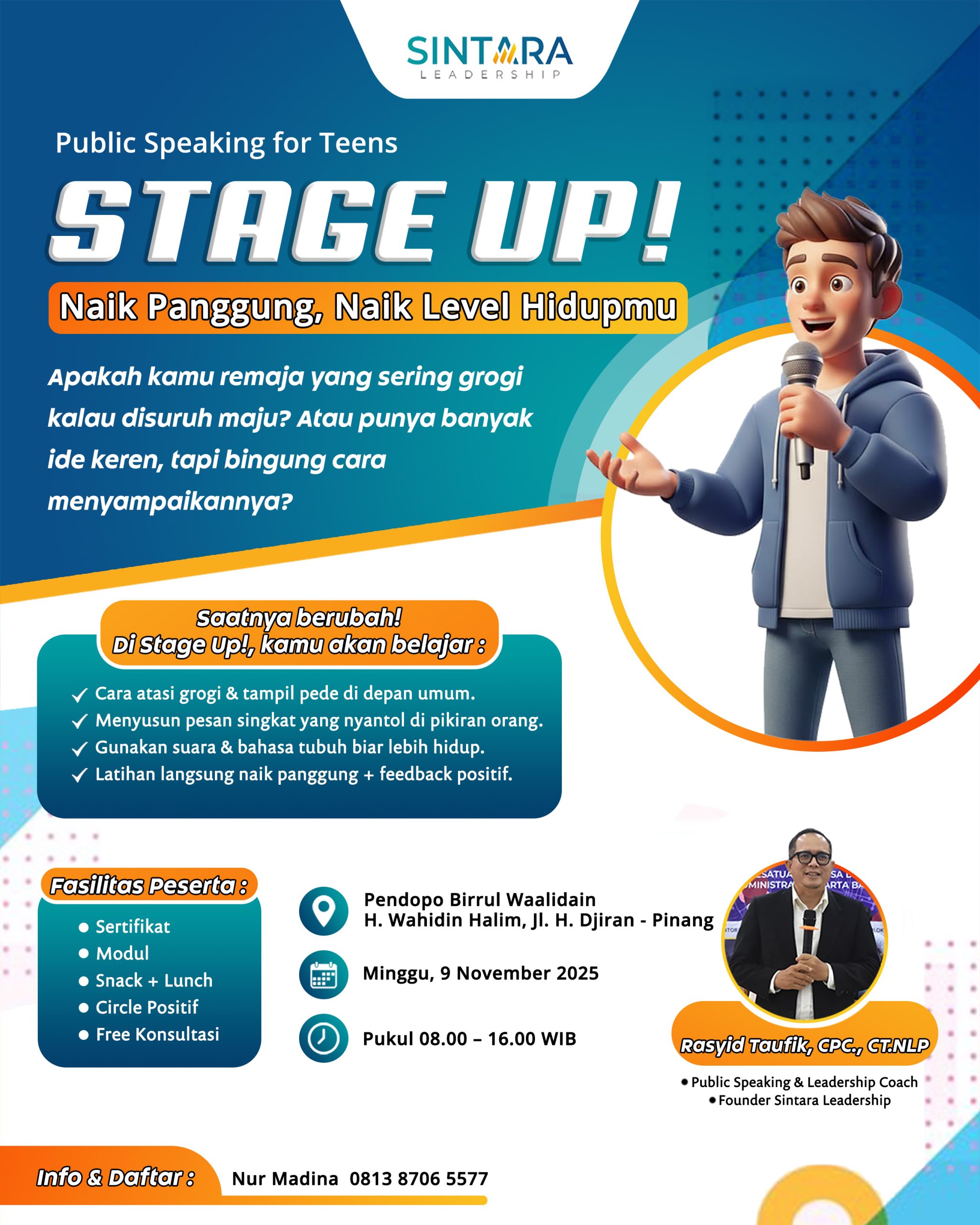 Menurut Rasyid Taufik, CPC., CT.NLP, Public Speaking & Leadership Coach sekaligus Founder Sintara Leadership, kemampuan berbicara di depan umum adalah keterampilan penting yang menentukan masa depan seseorang. Banyak remaja memiliki ide-ide hebat, namun kehilangan kesempatan karena tidak mampu menyampaikannya dengan percaya diri. “Melalui Stage Up!, kami ingin membantu para remaja agar tidak hanya berani naik panggung, tetapi juga naik level dalam hidupnya,” ujar Rasyid.
